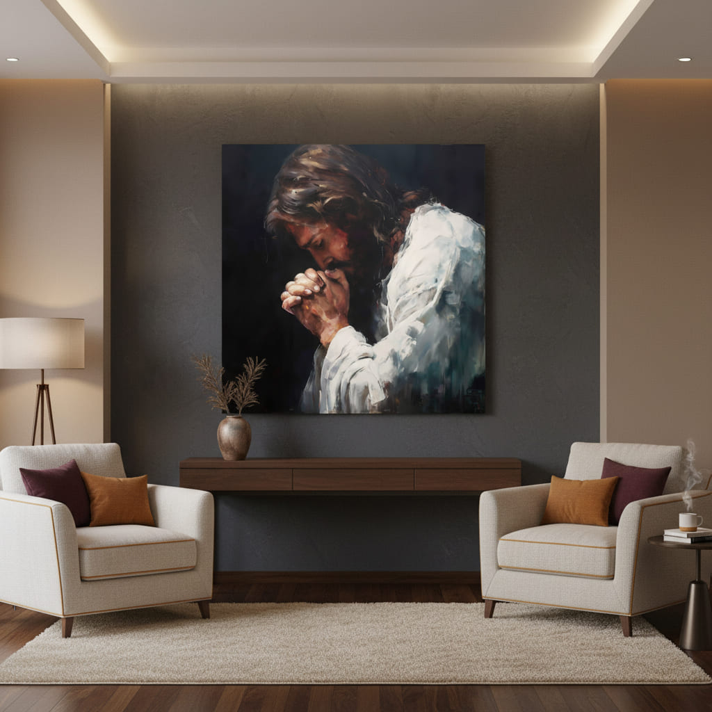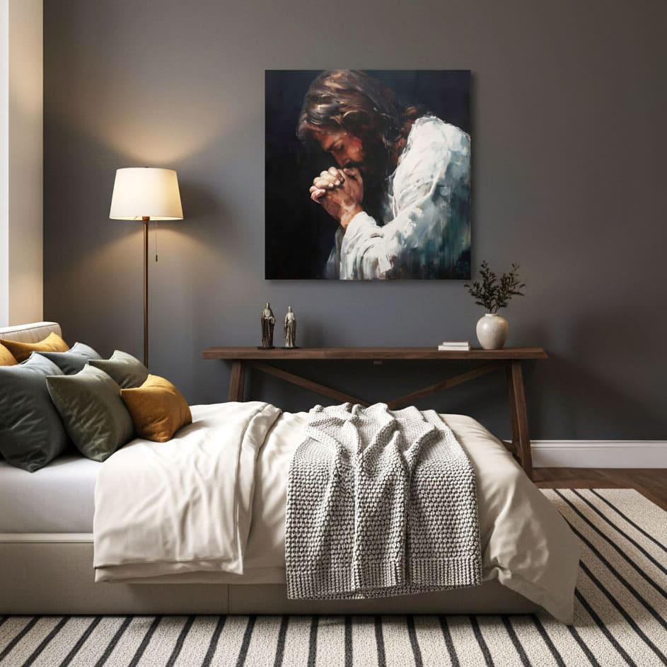 DormitorR: Tablourile cu tonuri calme și moi, cum ar fi Hristos cu o expresie pașnică, sunt ideale pentru dormitor, unde vor oferi camerei o atmosferă de liniște și intimitate.