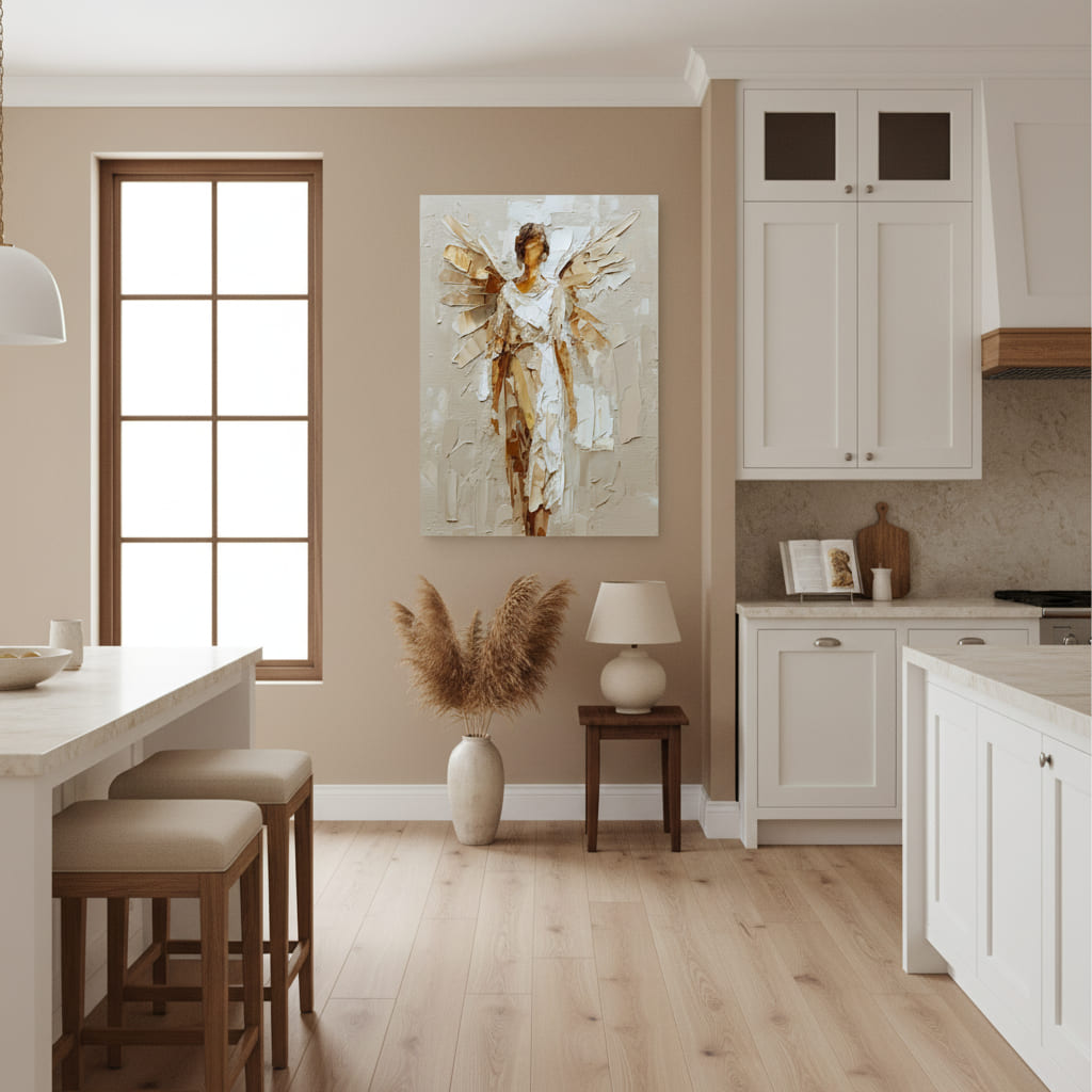 Camera de zi: Un tablou mare cu un înger poate fi un element dominant deasupra unei canapele sau a șemineului. Detaliile aurii și culorile moi vor atrage atenția și vor adăuga lux spațiului.