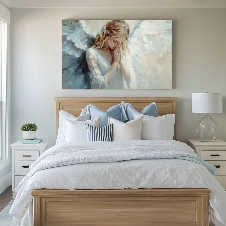 Dormitor: Tablourile în tonuri blânde cu îngeri vor aduce un sentiment de calm și siguranță în dormitor, perfecte pentru a fi amplasate deasupra patului.